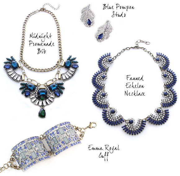 - Fanned Echelon Necklace : Deep navy baguettes line a double row of clear crystals, this necklace has just the right details to make it elegant yet oh-so-bold!