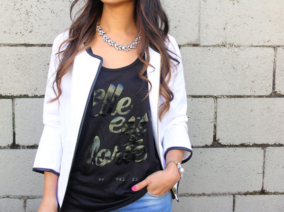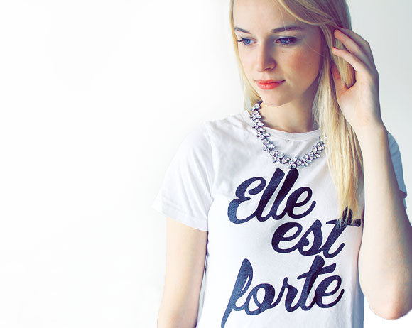 On the 2nd day of celebrations, o+p gave to me.... a sparkly necklace and an Elle Est Forte top. She Is Clothing is a brand we hold close to our hearts (and to our home too!). We love their inspirational tops, especially the original, "Elle est forte" shirt - She is Strong, Proverbs 31. Sometimes, we all need a little reminder of what gives us strength and keeps us going. Oh, and a little sparkle too!