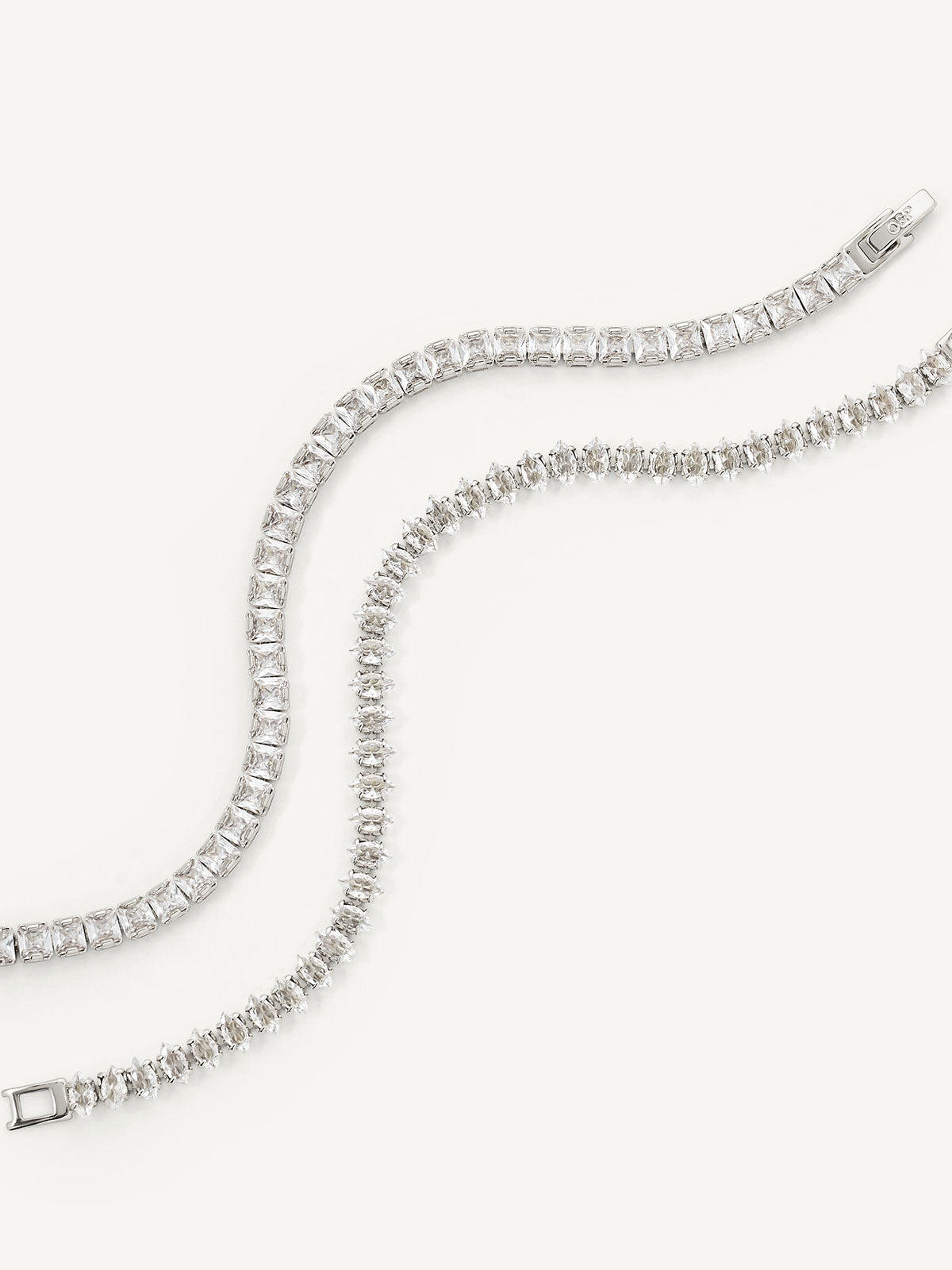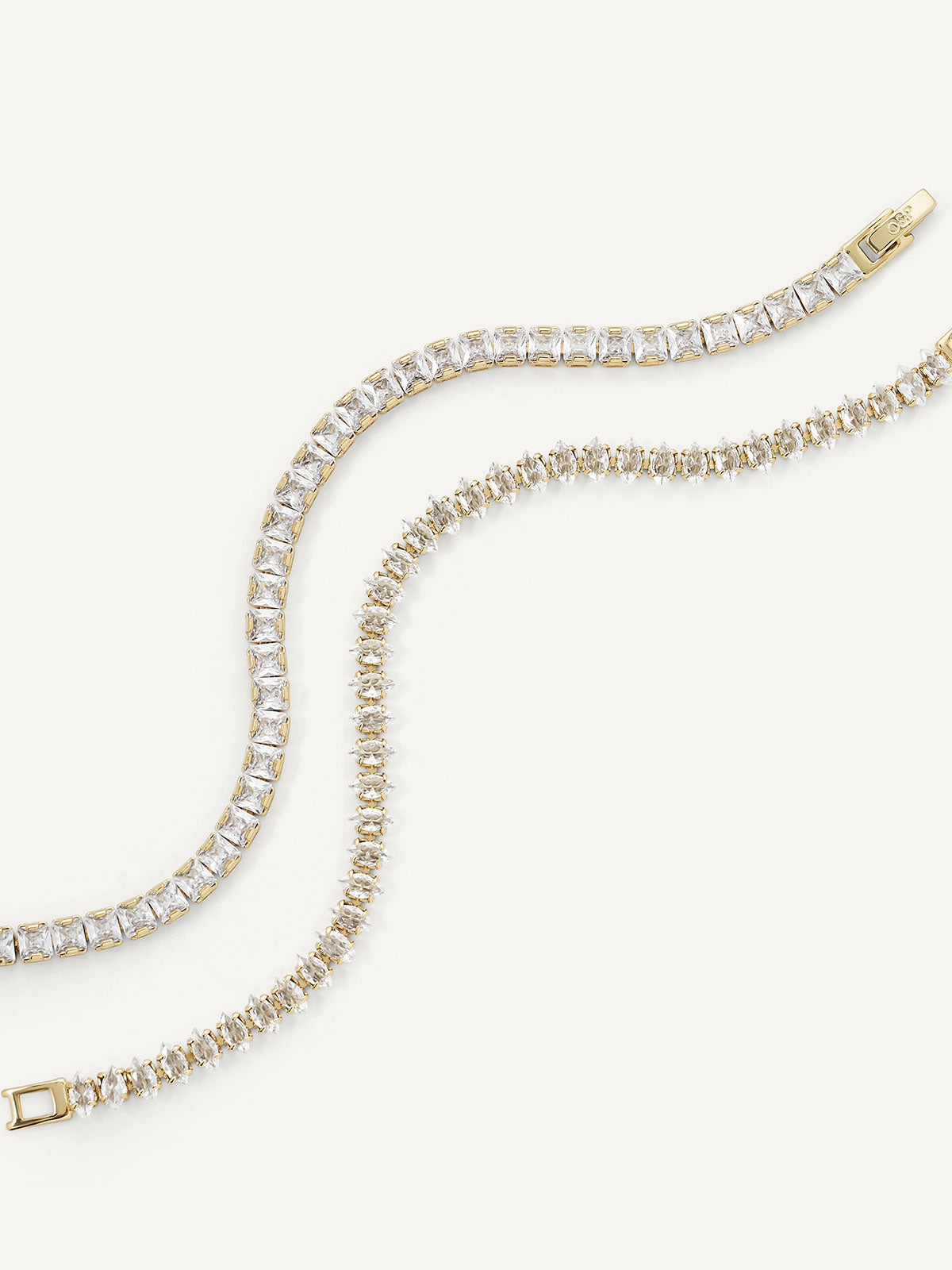 Add some serious sparkle to your wrist with this stunning bracelet duo. Made with a clasp with adjustable length for easy wear and comfort. Tennis bracelet, but make it fancy. This classic style can be worn on its own or stacked with other delicate wristwear for a layered look.